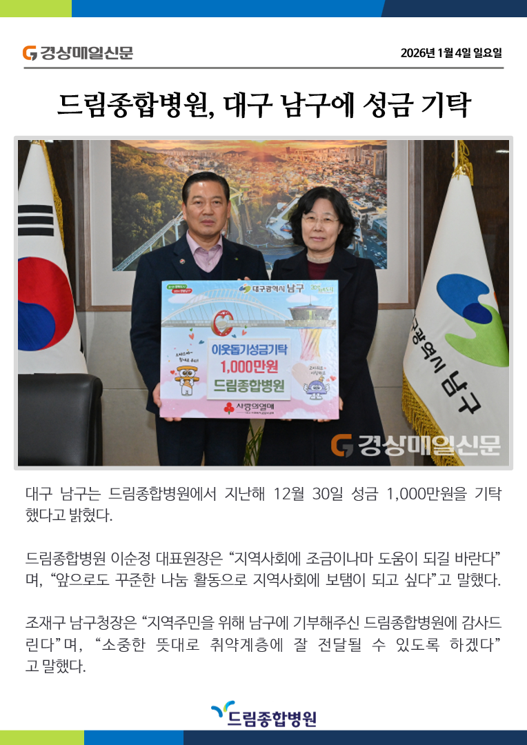 공지사항 | 드림종합병원, 대구 남구에 성금 기탁 | |