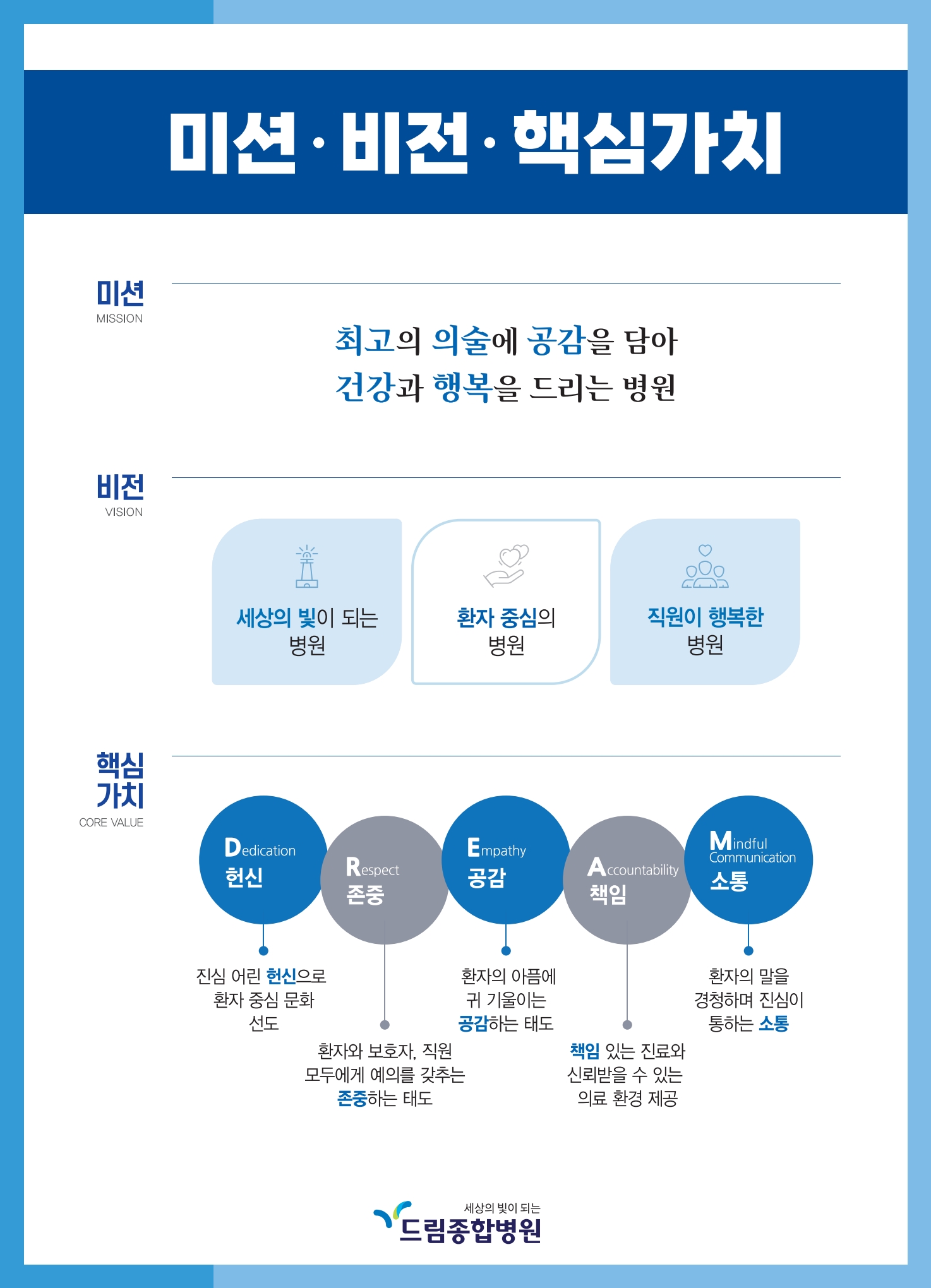 "Dream team, Dream service"를 나타내는 "드림종합병원, Dream General Hospital"입니다. "사랑과 건강을 돌려드린다"는 의미도 내포되어 있습니다.